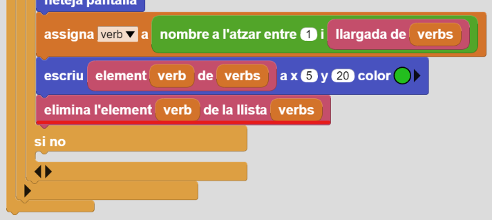 10. Si voleu que un cop hagi aparegut un verb no torni a aparèixer, heu de posar el bloc “elimina l’element…” de Dades + la Variable “verb” en el primer espai i la llista “verbs” en el segon espai:
