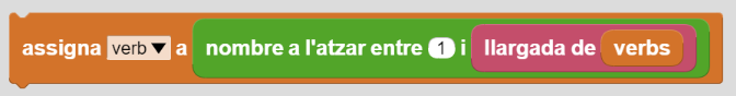 8. Seguidament, programeu els blocs perquè apareguin els verbs de forma aleatòria. Poseu el bloc “assigna…” de Variables i la Variable “verb” + el bloc d’Operadors “nombre a l’atzar entre…”. Heu de posar el nombre 1 en el primer espai i en el segon nombre afegiu “llargada de…” + la Variable “verbs”:
