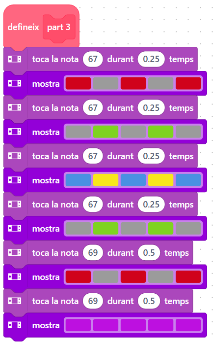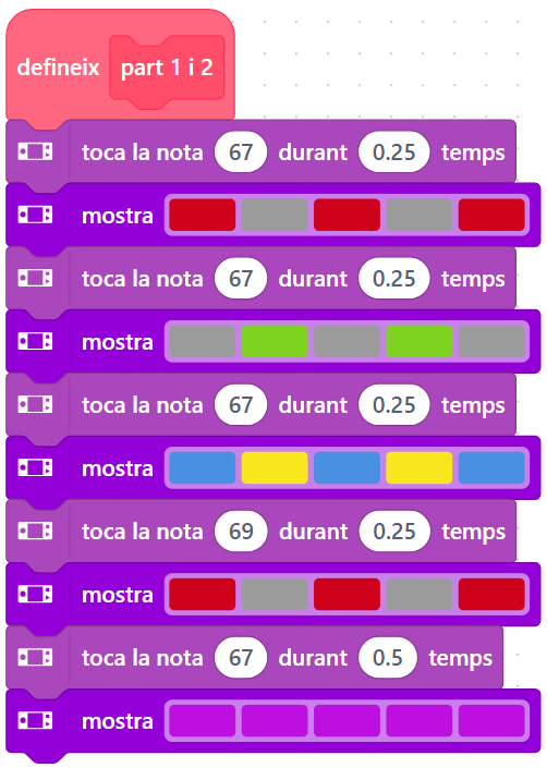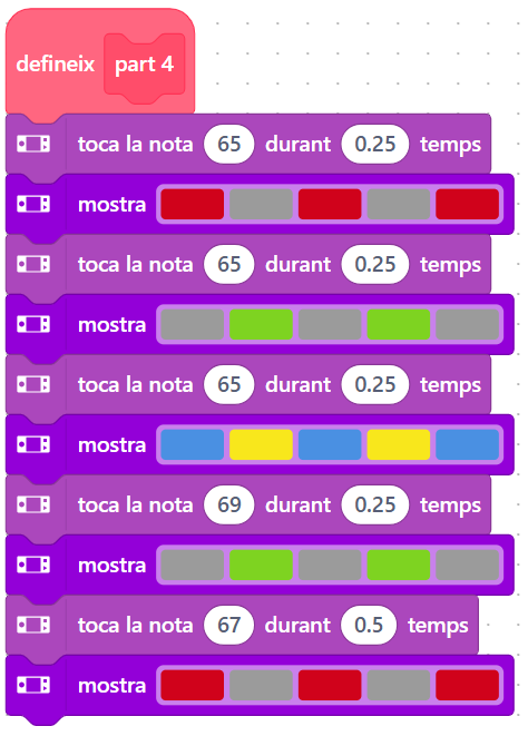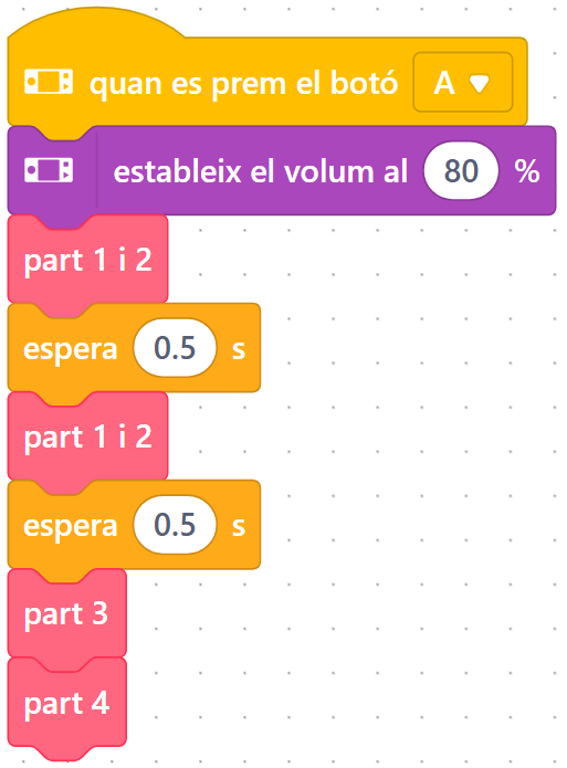 7. Torneu a posar un bloc “part 1 i 2”, seguit d’una nova espera de 0,5 segons. A continuació situeu-hi un bloc “part 3” i tot seguit un bloc “part 4” (fixeu-vos que entre les parts 3 i 4 no hi ha cap silenci):