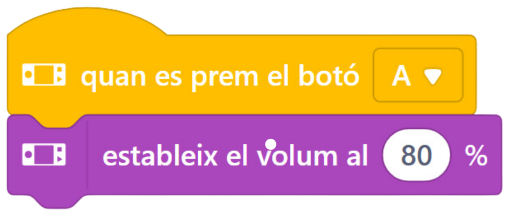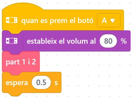 1. En primer lloc, programareu que en prémer el botó “A”, s’estableixi el volum al 80%, per tal que la cançó se senti prou fort. Podeu variar aquest valor per fer que se senti més fort o més fluix.