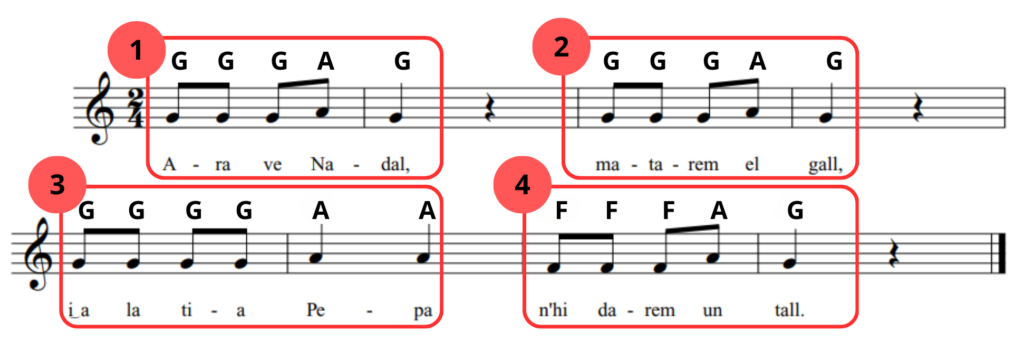 Per facilitar la comprensió de la programació, dividireu la cançó en parts i utilitzareu blocs propis. Separeu cada estrofa en 4 parts; cada part correspon a un dels versos de l’estrofa: