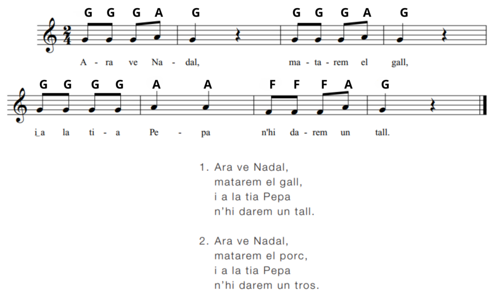 2. Volem que el robot “canti” la cançó “Ara ve Nadal”. Veureu que mblock utilitza el sistema de notació musical anglosaxó (A – La, B – Si, C – Do, D – Re, E – Mi, F – Fa, G – Sol). A la partitura que teniu a continuació, teniu la denominació de cadascuna de les notes en aquest sistema: