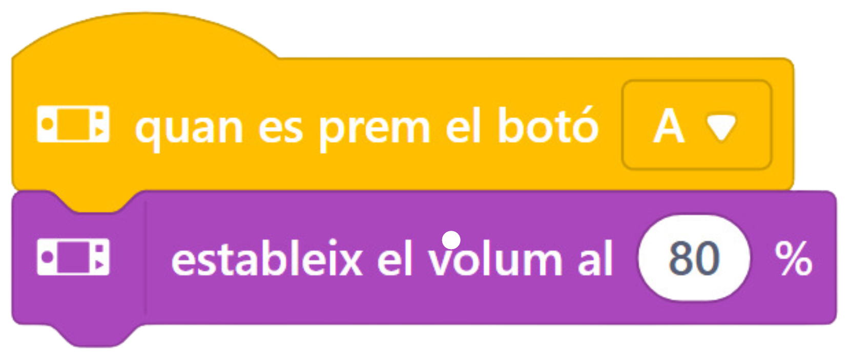 1. En primer lloc, programareu que en prémer el botó “A”, s’estableixi el volum al 80%, per tal que la cançó se senti prou fort. Podeu variar aquest valor per fer que se senti més fort o més fluix.