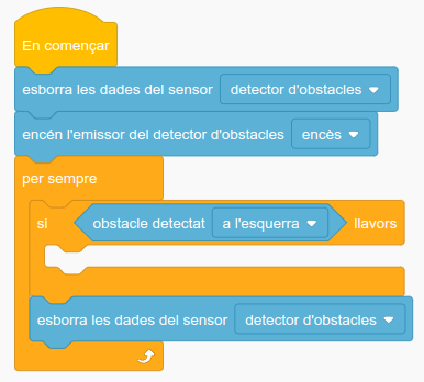 3. Programeu un bucle “per sempre”. Dins del bucle es programarà l’obertura i el tancament de la porta si hi ha alguna presència. A continuació, fora del condicional, esborreu les dades del sensor: