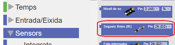 - Dreta i esquerra: de la categoria “Sensors”, busqueu el bloc “Segueix línies (IR)”: