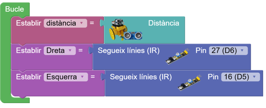 A l’exemple, s’estan utilitzant els pins 27 (D6) per al sensor de seguiment de línia IR de la dreta i 16 (D5) per al sensors de seguiment de línia IR de l’esquerra. També podeu utilitzar els blocs de seguiment de línia que trobareu a la categoria 3D Bot.