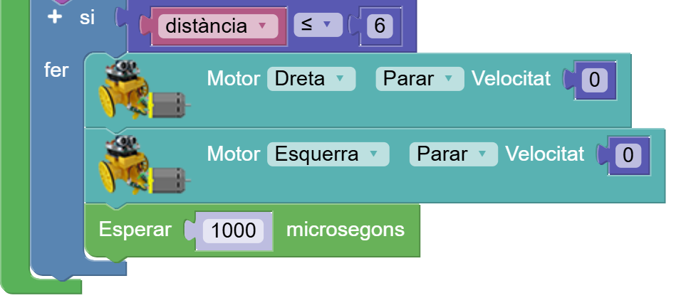 3. Comenceu la programació amb un condicional que faci que el vehicle s’aturi si detecta un objecte a una determinada distància (a l’exemple 6 cm). De la categoria “Lògica” trieu el bloc “si…fer” i feu que si la variable “distància” té un valor menor o igual a 6 cm, el vehicle s’aturi (el bloc “… <=…” el trobareu a la categoria “Matemàtiques”). Per fer-ho, de la categoria “3DBot” trieu els blocs “Motor Dreta Parar” i “Motor Esquerra Parar”. També podeu utilitzar el bloc “Moure” i triar “parar”. En aquest exemple treballarem amb els motors per separat, perquè això us permetrà tenir més control i precisió en els moviments del vehicle. També hi podeu posar un temps d’espera al final: