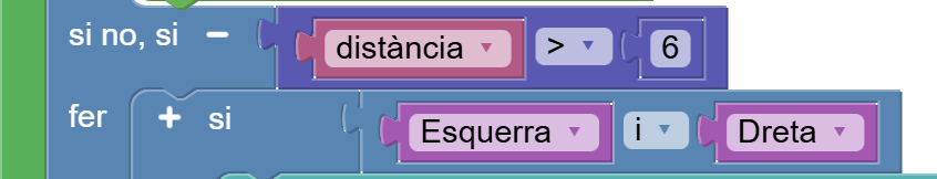6. A continuació, situeu un nou condicional i un bloc de comparació booleà “… i …” que trobareu a la categoria “Lògica” i els valors de les variables “Dreta” i “Esquerra” a banda i banda: