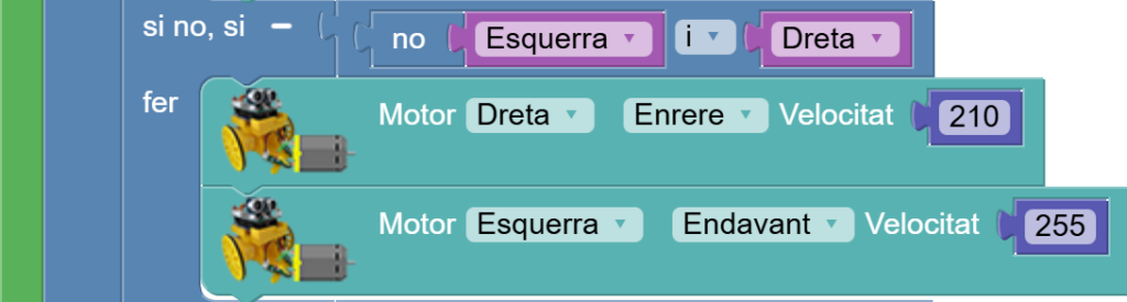 9. Programeu la resposta per al cas 3, és a dir, què han de fer els motors quan el sensor esquerre detecta negre i el sensor dret detecta blanc. És una programació anàloga a l’anterior: