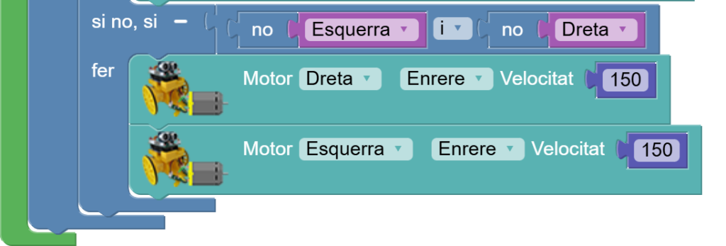 10. Per últim, heu de programar el cas 4, és a dir, la resposta dels motors quan es doni la situació que cap dels dos sensors està detectant el color negre. En aquest cas, fareu retrocedir el vehicle per tornar a buscar la línia negra. Disminuïu la velocitat per facilitar que, si passa de nou per la línia negra, tingui temps de fer la lectura: