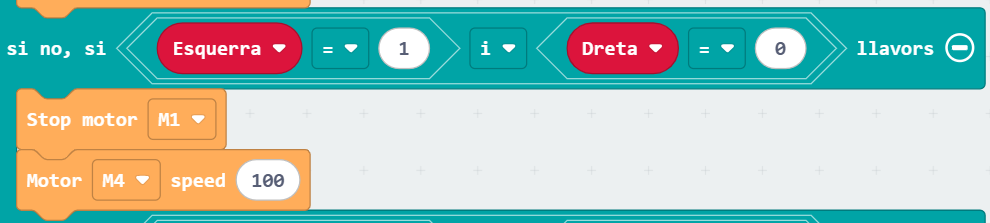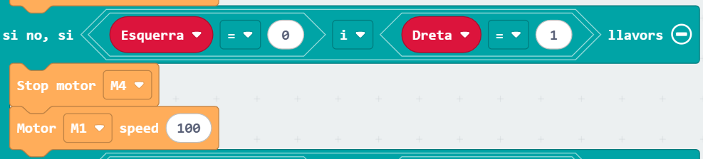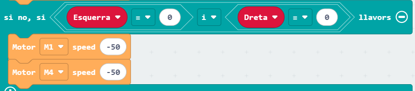 Per últim, de la categoria “micro:shield”, seleccioneu els motors M1 i M4 feu que avancin a màxima velocitat (100):