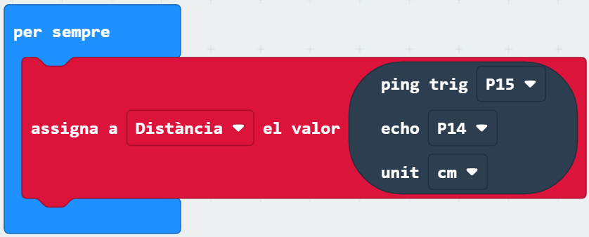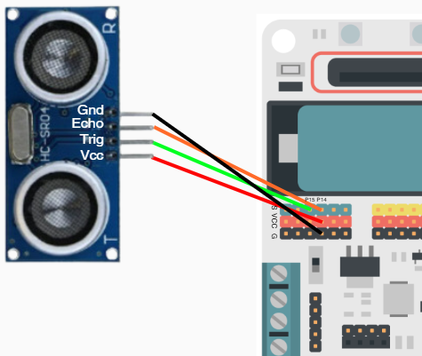 A l’exemple, s’estan utilitzant els pins P14 i P15 per al sensor d’ultrasons. El pin P15 ha d’estar connectat al pin marcat com “trig” en el sensor, mentre que el pin P14 ha d’anar connectat al pin marcat com “echo”: