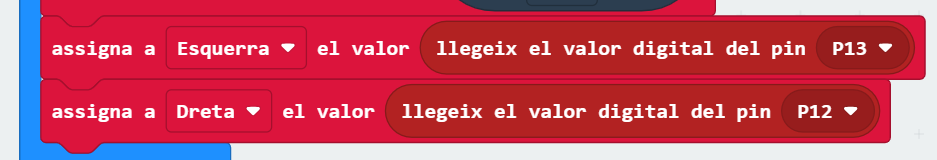A la variable “esquerra” li assignareu “el valor “llegeix el valor digital de P13”, mentre que a la variable “dreta” li assignareu “llegeix el valor digital de P12”. Com en el cas del sensor d’ultrasons, si voleu utilitzar uns altres pins, vigileu que la correspondència sigui correcta.
