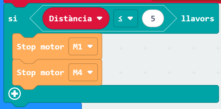 4. Comenceu la programació amb un condicional que faci que el vehicle s’aturi si detecta un objecte a una determinada distància (a l’exemple 5 cm). De la categoria “Lògica” trieu el bloc “si cert… llavors…” i feu que si la variable distància té un valor menor o igual a 5 cm, el vehicle s’aturi. Per fer-ho, de la categoria “micro:shield” trieu els motors que estigueu utilitzant (a l’exemple M1 i M4) i seleccioneu el bloc “Stop motor…”