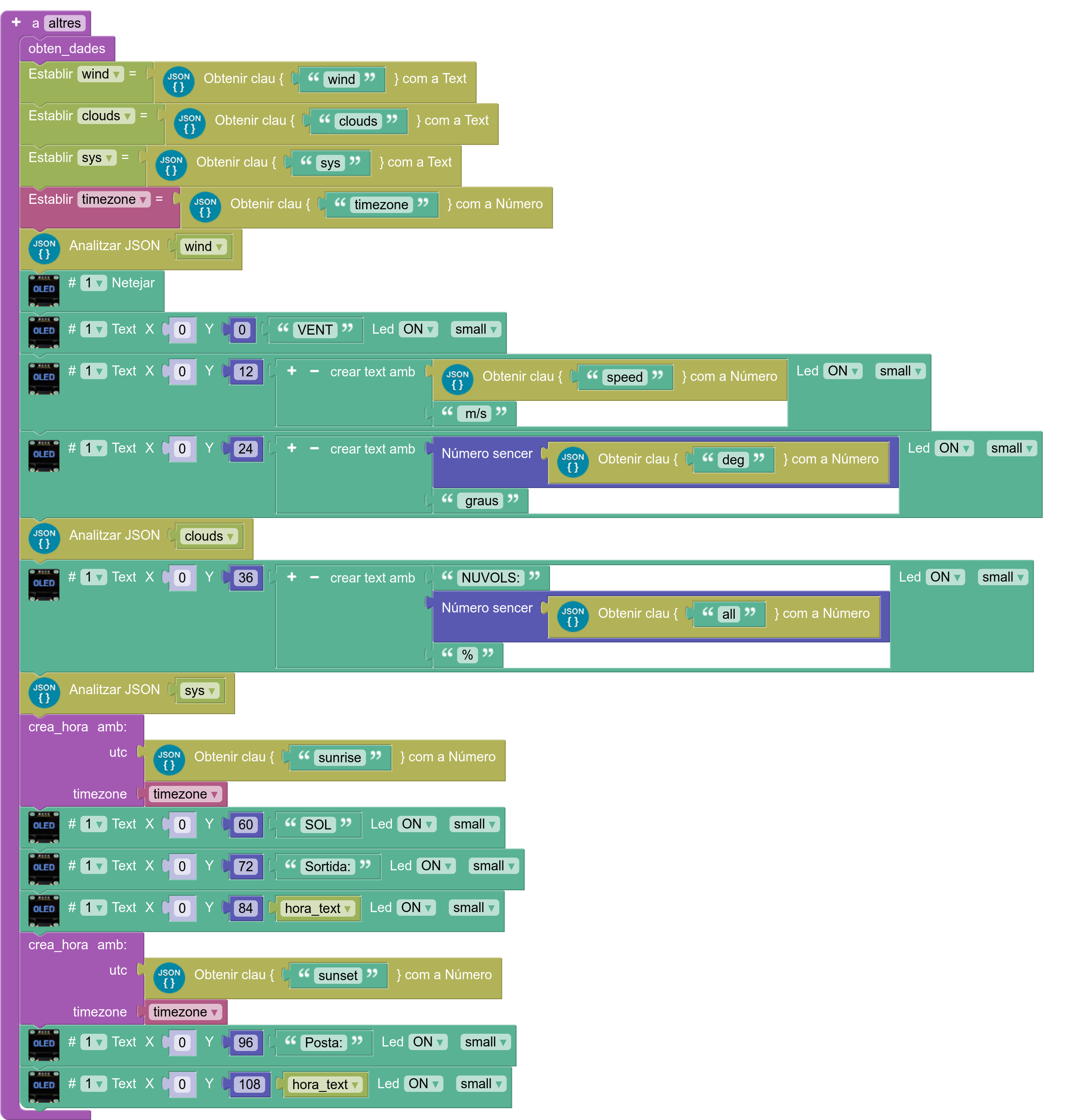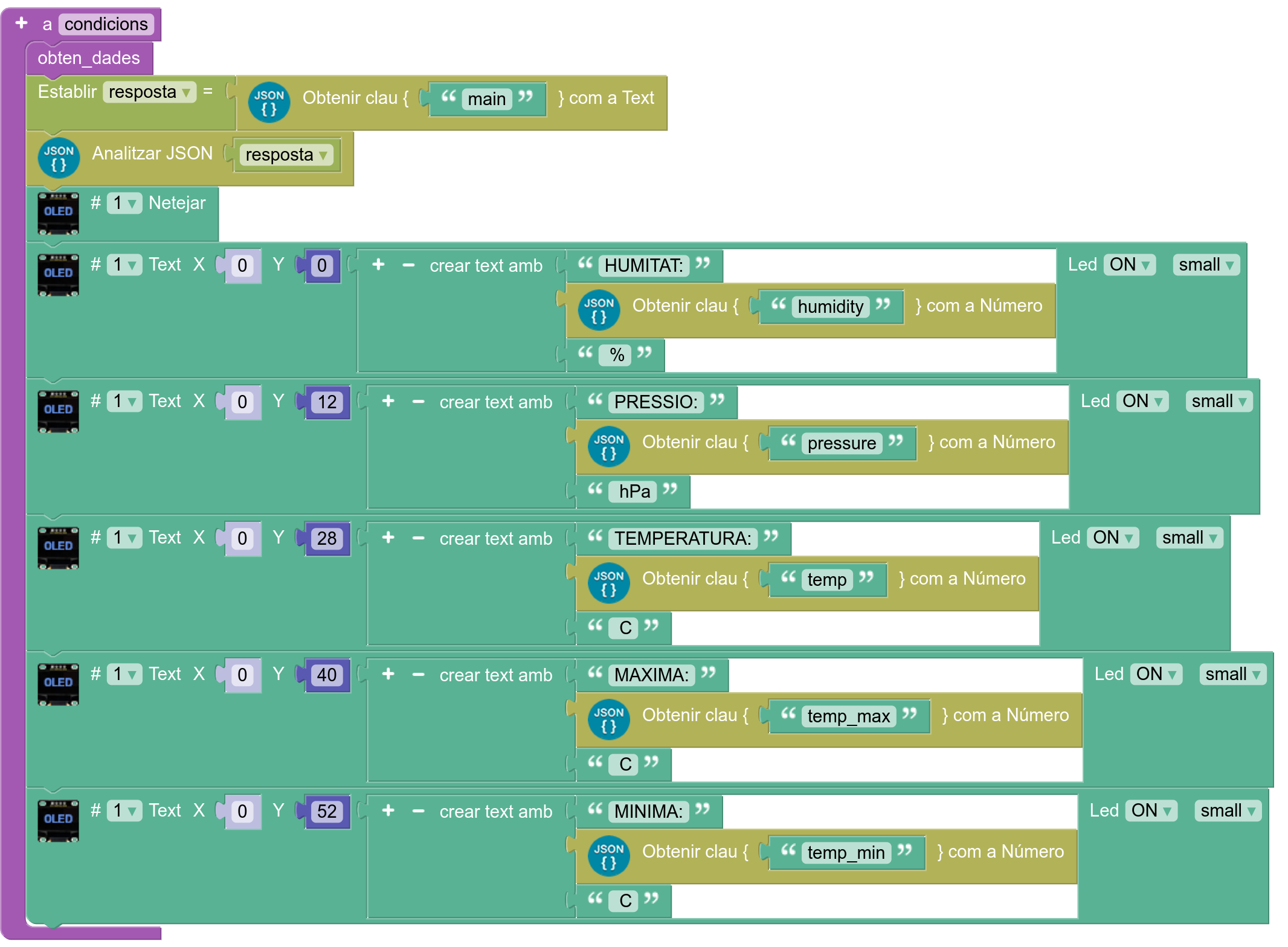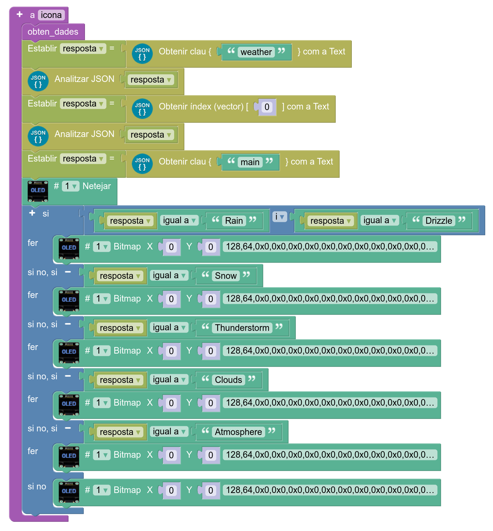 8. Definiu el procediment per mostrar la icona corresponent al temps actual. El text corresponent a cada icona es pot obtenir amb l’“OLED – Bitmap editor” d’ArduinoBlocks, utilitzant les icones del temps que es faciliten a la secció de descàrregues: