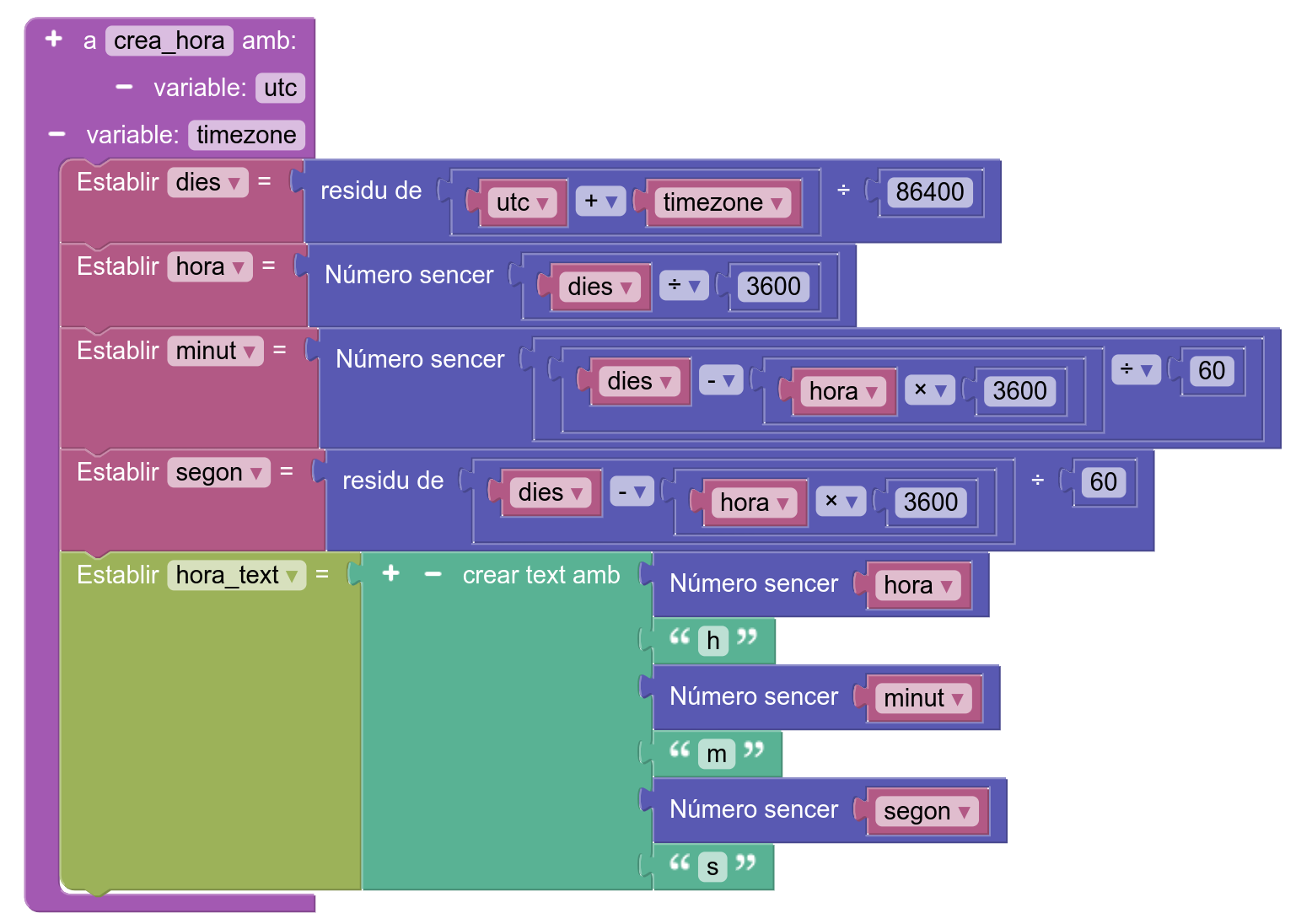 9. Definiu el procediment que calcula l’hora del dia en funció d’instants en format unix UTC. S’ha de tenir en compte el nombre de segons en un dia (86.400), el nombre de segons en una hora (3.600), el nombre de minuts en una hora (60) i el nombre de segons en un minut (60):