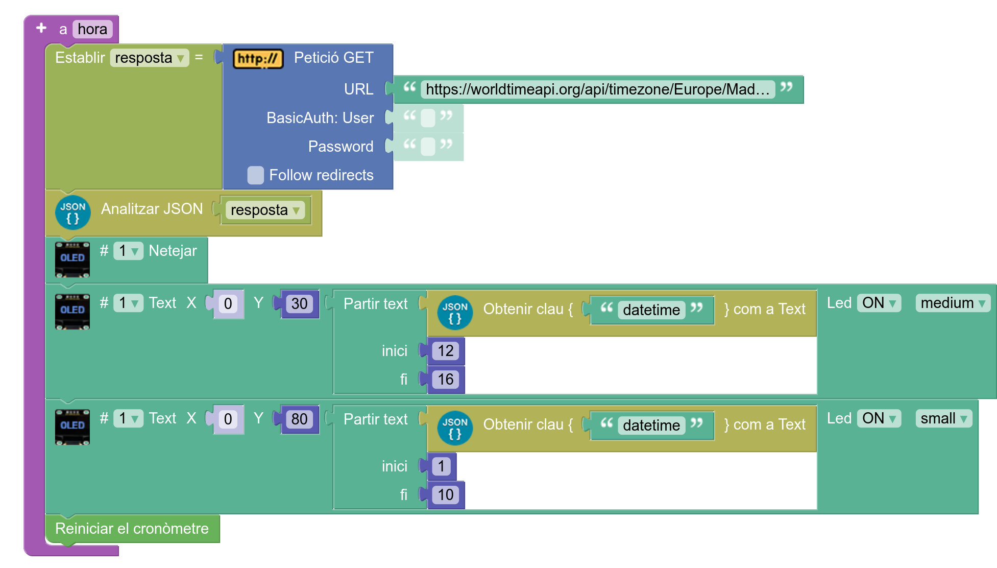 11. Definiu el procediment per mostrar el dia i l’hora. La informació s’obté a partir d’una crida a una API, indicant una ciutat en el fus horari correcte. Utilitzeu aquest URL.