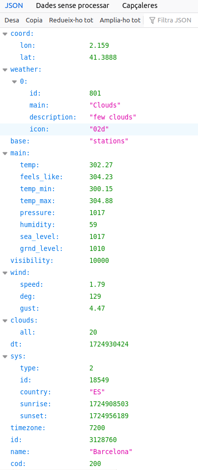 4. En el navegador Mozilla Firefox, escriviu l’URL per obtenir la informació atmosfèrica actual a partir d’una crida a l’API d’OpenWeather, on nom_lloc és el nom de la població i clau_api la clau API. Aquest navegador mostra les dades retornades en format JSON en un format fàcilment llegible: