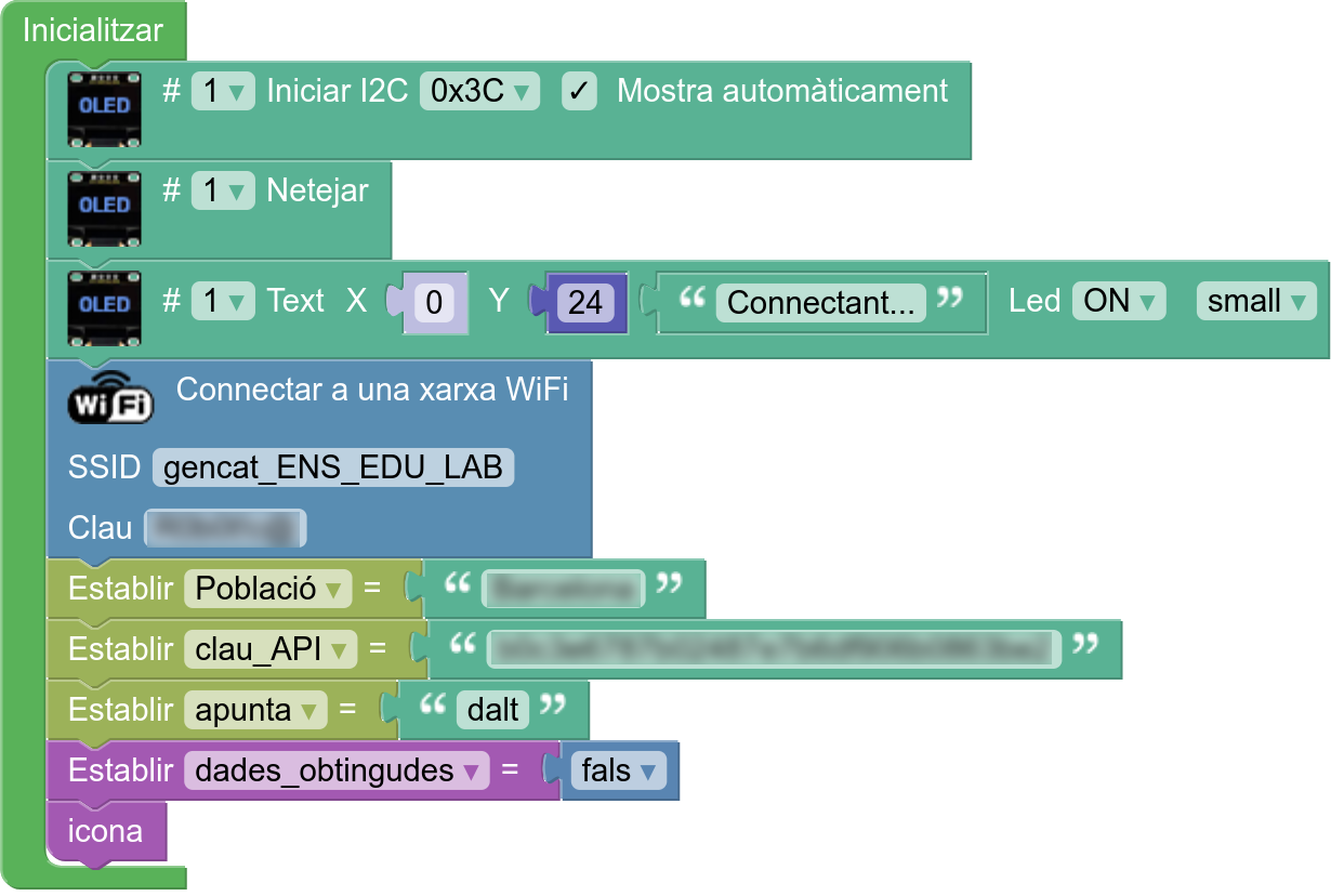 12. Ompliu el bloc d’inicialització, on la placa es connecta a Internet i s’assignen valors a certes variables, que heu de definir prèviament: