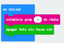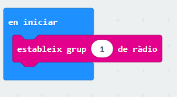 2. Anar a l’entorn de programació de micro:bit makecode per programar la placa que fa de comandament a distància (en endavant s’anomenarà placa 1). Programarem la funció de ràdio perquè la placa enviï per ràdio un missatge a la placa que està situada al Cutebot (en endavant, placa 2). Per fer això, utilitzarem el bloc “estableix grup 1 de ràdio” que es troba a la categoria de ràdio.