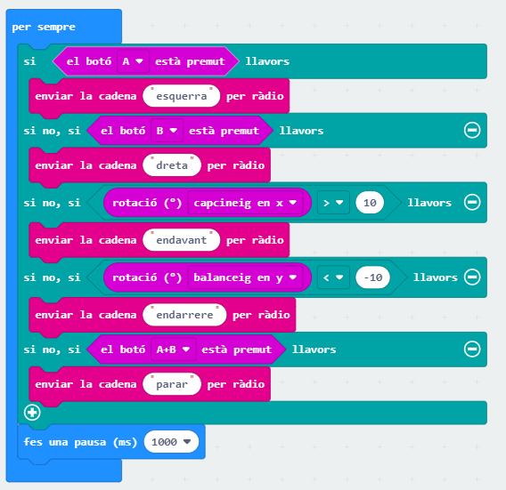 Tot seguit fem servir els blocs de la categoria “ràdio” “en rebre per ràdio una cadena “receivedString” que crea automàticament una variable (anomenada receivedString) a la qual s’assignarà la cadena de text que arriba des de la placa 1. Aquí s’ha de fer coincidir exactament els textos que s’han fet servir a la programació de la placa 1 (en aquest exemple esquerra, dreta, endavant, endarrere i parar) i posar un condicional de manera que, quan la variable contingui un text determinat, activi els motors de les rodes per executar els moviments: