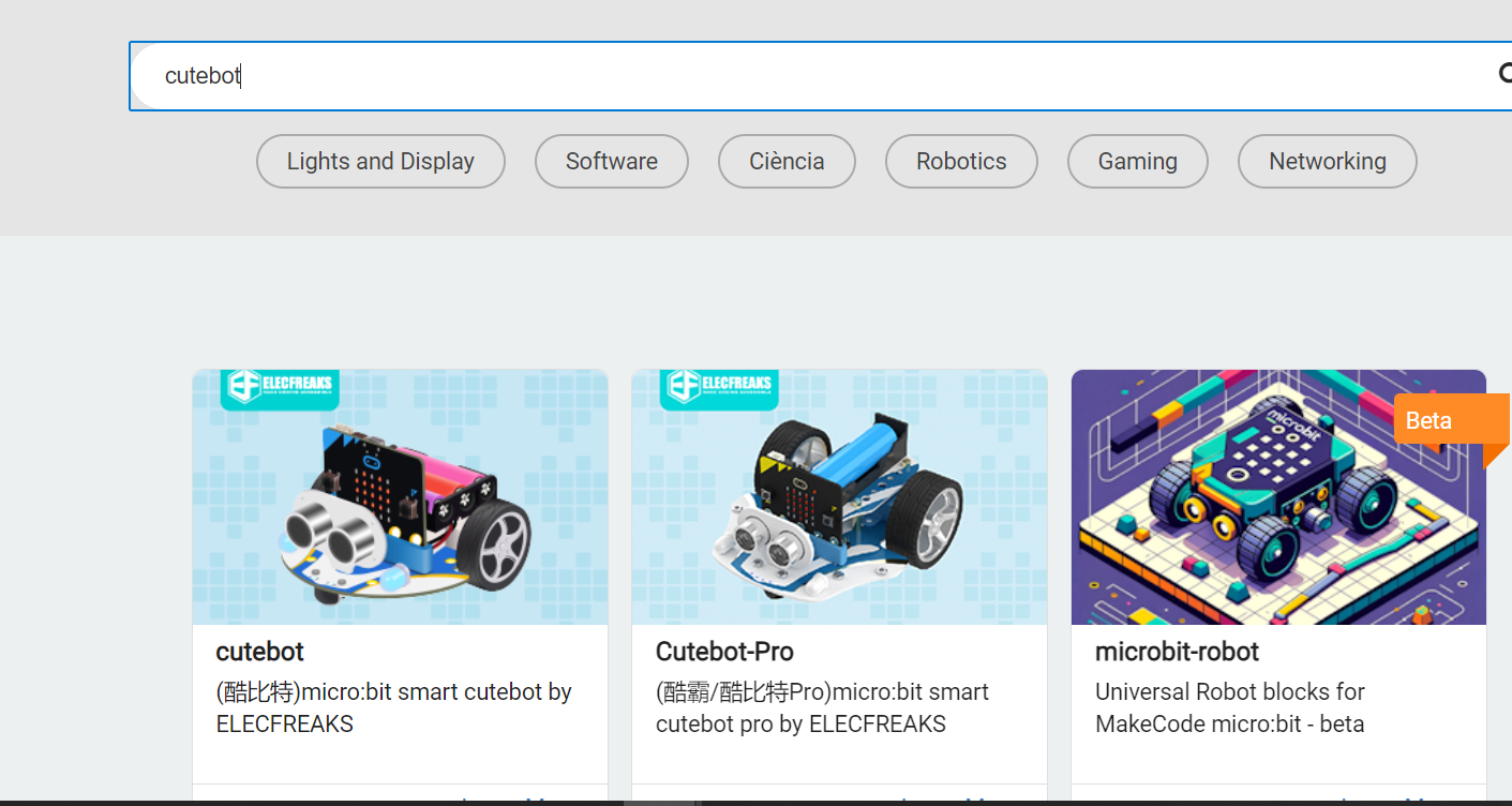 4. Programació de la placa 2: Cal crear un nou projecte a l’entorn MakeCode per aquesta placa. A continuació, carregar l’extensió per poder treballar amb el Cutebot. Anar a l’apartat “+ Extensions” i al cercador que s’obre escriure “Cutebot” i triar “Cutebot” o “Cutebot-Pro”, en funció del robot que es tingui: