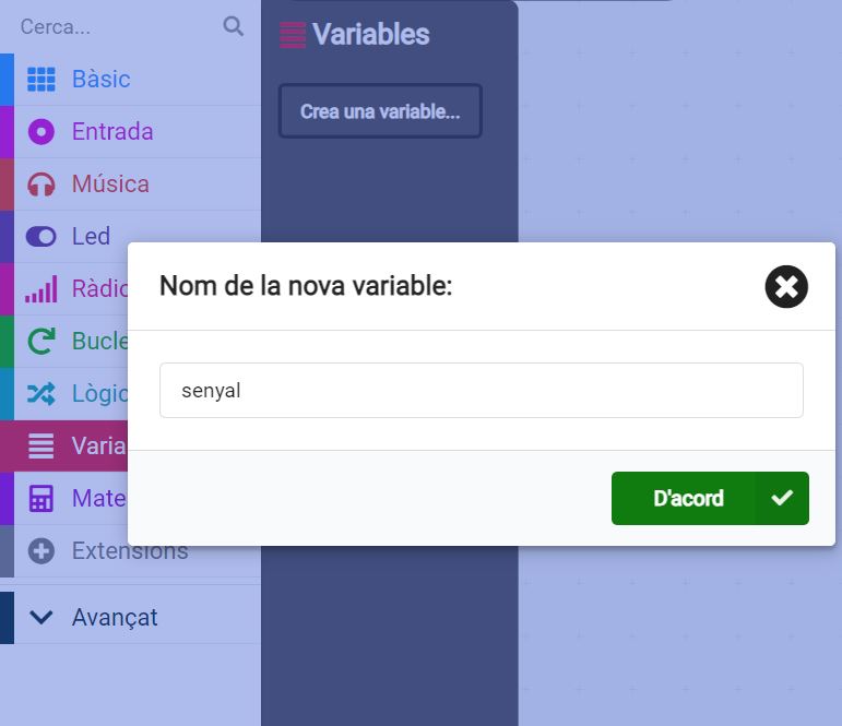 4. Creeu la variable “senyal” perquè indiqui el valor de la intensitat de ràdio. A la llibreria variable, cliqueu “crear una variable” i poseu-li el nom senyal: