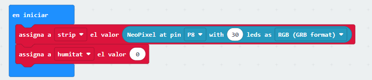 Crearem la variable “humitat” i la inicialitzarem en el bloc “en iniciar”. Per fer això farem servir el bloc “assigna a… el valor…” que trobarem dins la categoria Variables. En iniciar el programa, cal indicar el port en què tenim connectada la tira de leds (en el cas de l’exemple, el port de 8 de la micro:shield) i dir quants leds té (en el cas de l’exemple, la tira en té 30). En la següent imatge es pot veure el codi que correspon a la inicialització de la variable “humitat” i la tira de led “strip”:
