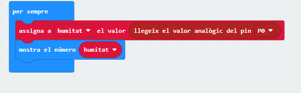 6. Calibratge del valor d’humitat. Caldrà fer una prova per detectar quin és el valor màxim d’humitat que pot detectar cada sensor. Per fer això, caldrà submergir els elèctrodes del sensor d’humitat en un got d’aigua per llegir el valor màxim. El valor que donarà serà entre 600 i 900. Farem que a lectura directa del valor es mostri en la micro:bit. Els blocs es mostren a la imatge