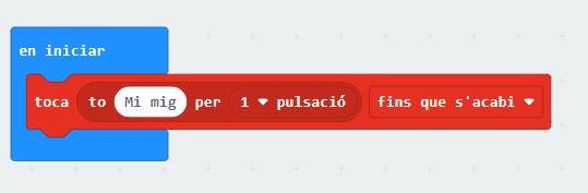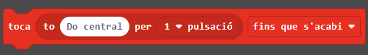 4. Dins l’apartat “Música” seleccioneu el bloc següent, que permet seleccionar la nota i la duració. L’alumne haurà d’anar triant la nota i la durada de cada nota per anar creant els compassos. Aquest bloc s’ha de fer servir dins de l’apartat “en iniciar”, però també podem programar-ho amb el bloc “en prémer el botó A” perquè la cançó soni un cop premem aquest:
