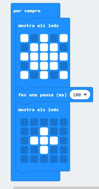 9. Podeu fer que a la pantalla es mostri una imatge intermitent durant la reproducció de la cançó. Per fer això, feu servir el bloc “mostra els leds” de la categoria “Basic” i dibuixeu dues imatges diferents, posant un bloc de pausa entremig de les imatges: