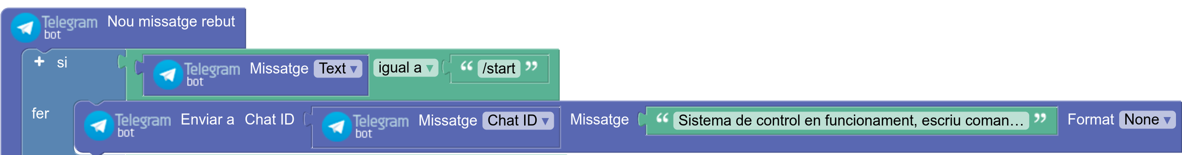 5. En l’esdeveniment que es produeix en rebre una comanda, la placa respon en funció del text rebut. Tots els blocs de programació estan dins d’una única estructura “si – si no, si”. Quan un usuari utilitza un bot per primera vegada, li envia la comanda “/start”: