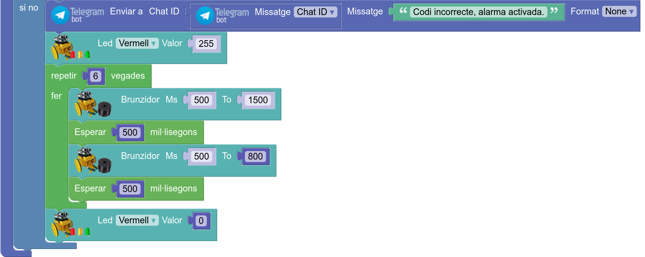 8. Si el sistema rep una comanda incorrecta s’activa el led vermell i un brunzidor fa sonar una alarma durant 6 segons: