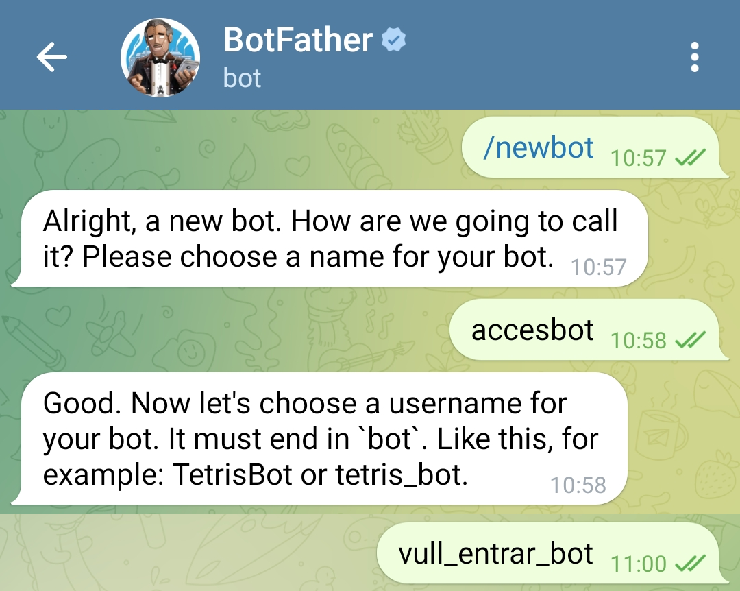 1. En l’app Telegram, cercar el bot “Bot Father” i enviar-li la comanda “/newbot”. Assignar un nom i un nom d’usuari al bot: