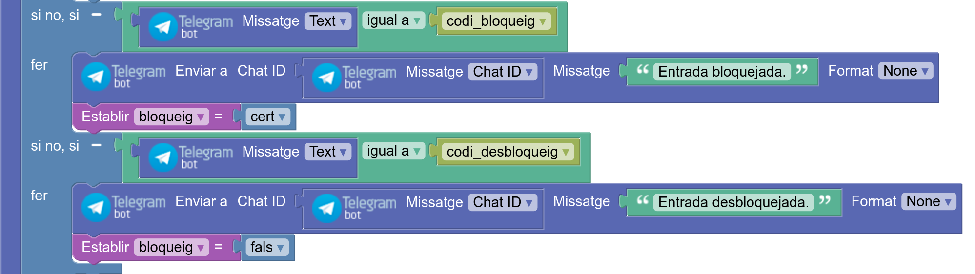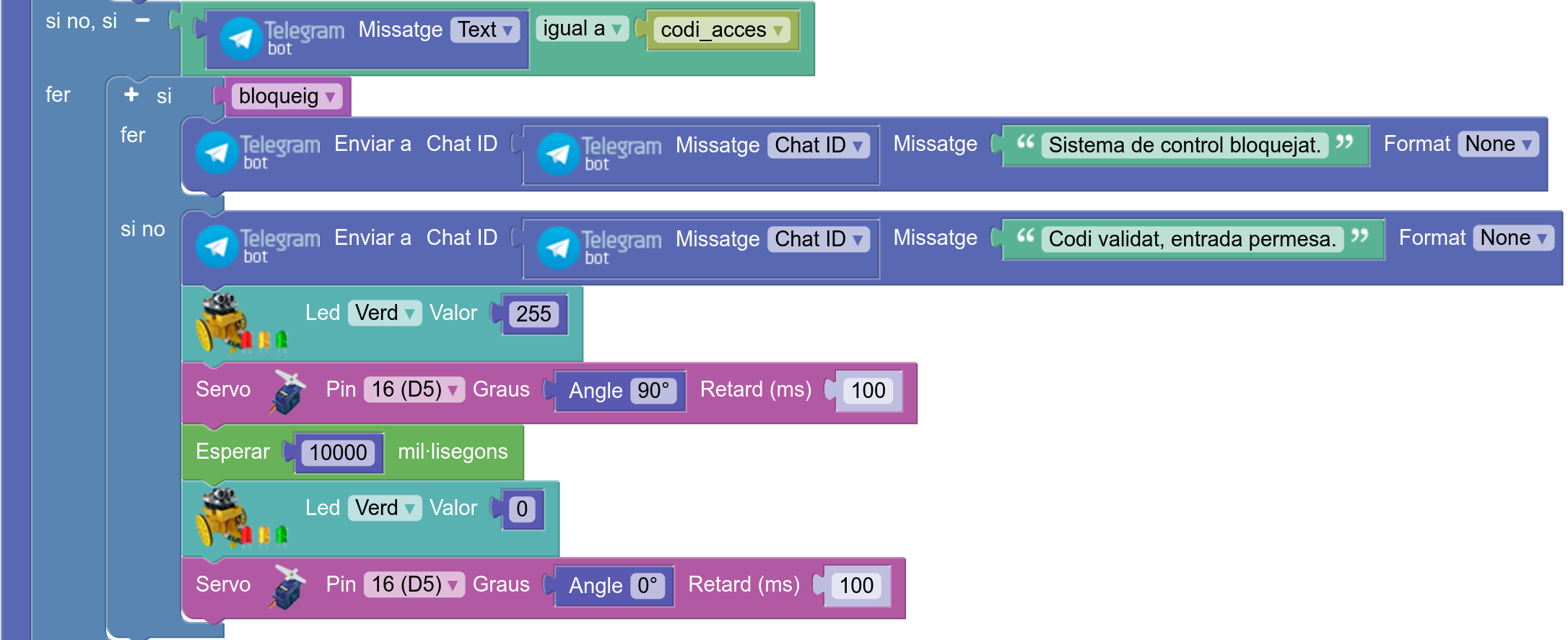 En l’activitat es programa el sistema de control d’accés a un local. L’administrador posa a disposició dels usuaris del local un bot de Telegram per entrar-hi i els comunica el nom del bot i la comanda que obre la porta. El bot admet també comandes d’administrador per bloquejar o desbloquejar globalment l’accés. La programació es fa en una placa ESP32 STEAMakers amb una placa d’extensió (Imagina 3dBot o TdR STEAM). El sistema mostra indicacions visuals i sonores i acciona un servomotor que obre o tanca la porta (activitat adaptada a partir del taller de la #JPRE24 dinamitzat per Raül Pegueroles i Raül Ventura).