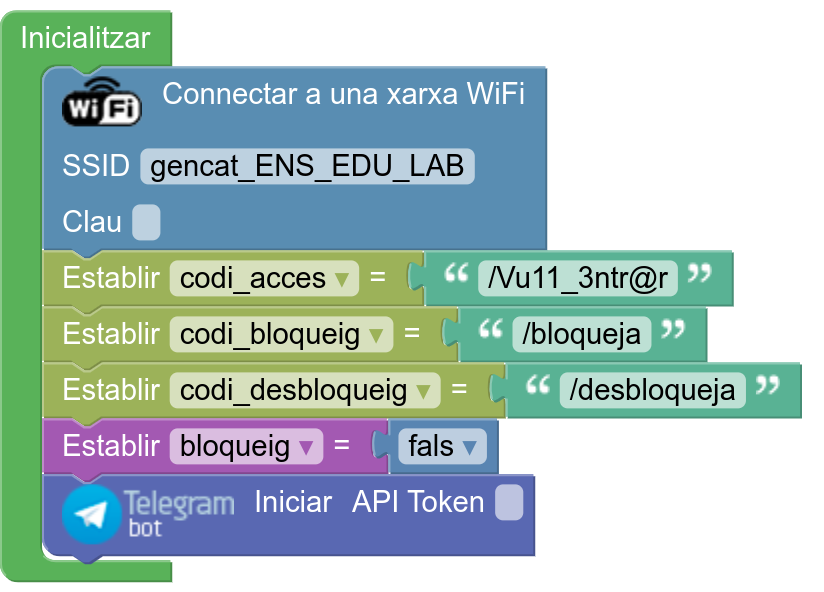 4. En el bloc d’Inicialització s’ha d’establir la connexió a Internet. També es defineixen les comandes que acceptarà el bot i una variable d’estat. S’inicia la comunicació amb el bot de Telegram (cal utilitzar el Token del bot):