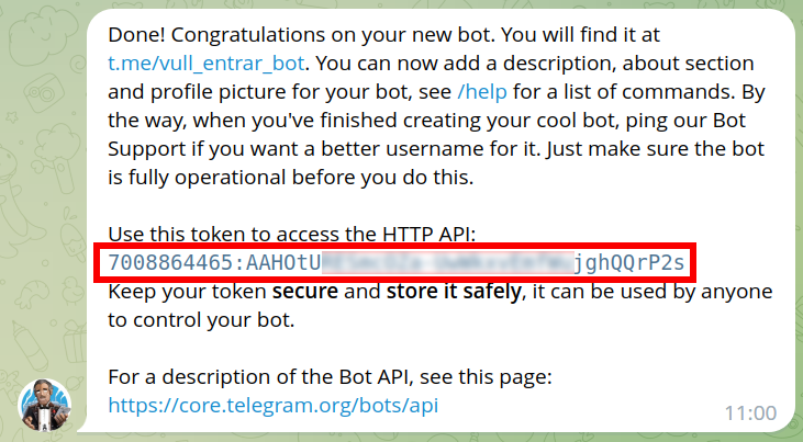 2. Cal copiar el codi (Token) que ens proporciona el missatge del “Bot Father”: “Use this token to access the HTTP API: XXXXXXXXXXX”: