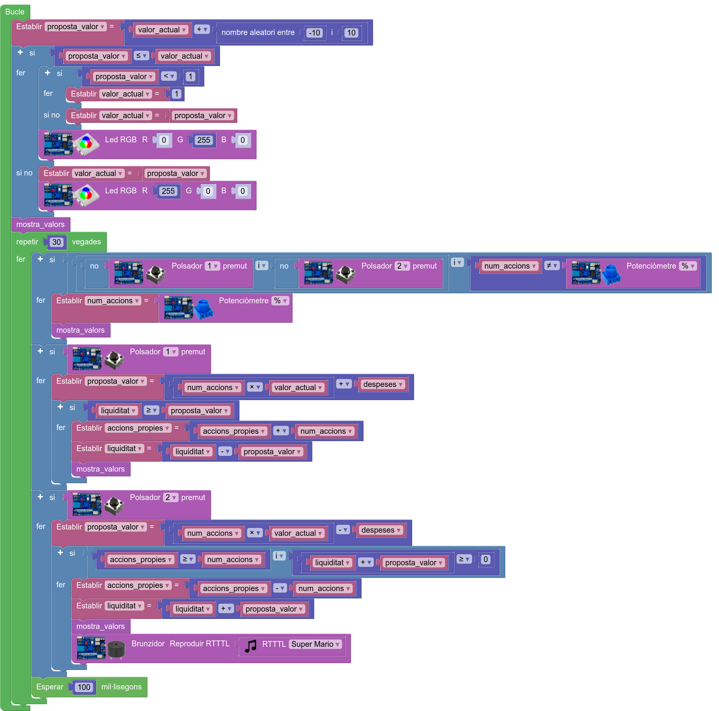 4. Programeu el bucle principal. La cotització de cada acció puja o baixa cada 3 segons, de forma aleatòria. Quan la cotització puja s’encén el led RGB amb color vermell i quan baixa s’encén amb color verd. Amb el potenciòmetre de la TdR STEAM l’inversor determina el valor de num_accions. El botó 1 serveix per comprar accions (si es té prou liquiditat) i el botó 2 per vendre’n. En cada venda exitosa sona un fragment musical:
