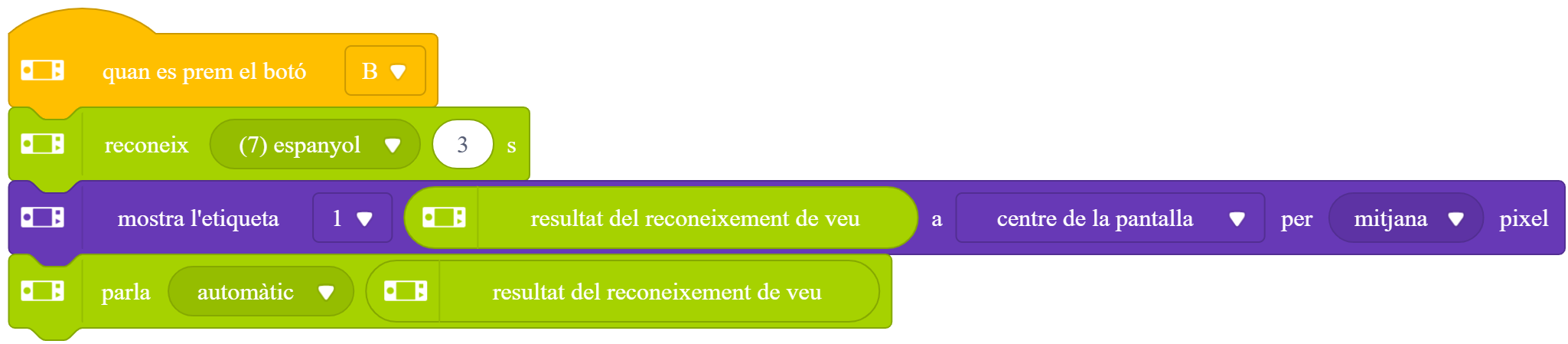 4. Programeu que, en prémer el botó B, la CyberPi reconegui paraules en castellà. Tot seguit, programeu que la CyberPi pronunciï les paraules reconegudes i les mostri a la pantalla: