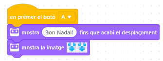 1. En primer lloc, programareu que en prémer el botó “A”, el Codey Rocky us mostri el missatge “Bon nadal” i mostri els ulls simulant les banyes d’un ren. Per fer això, fareu servir els blocs “Aspecte”: