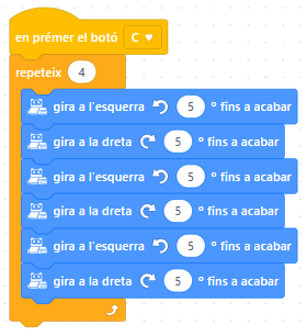6. Finalment, programareu que en prémer el botó “C”, el robot es mogui simulant un “ball”. En la imatge es mostra un exemple senzill, però fent servir els blocs de moviment podeu fer les vostres pròpies “coreografies”:
