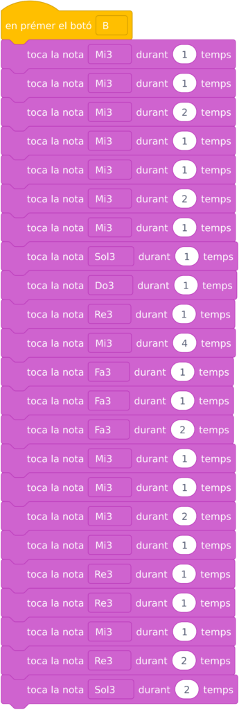 4. Programació de la cançó. Fareu servir els blocs que es troben a la categoria “altaveu” per fer sonar les notes. Haureu d’explicar als alumnes la durada de cada figura musical (negra= 1 temps, blanca= 2 temps, rodona= 4 temps). Per ajudar a la programació, podeu escriure el nom de cada nota sobre la partitura, per així traslladar més fàcilment la seqüència al programa. En la següent imatge es mostra la seqüència per als 8 primers compassos: