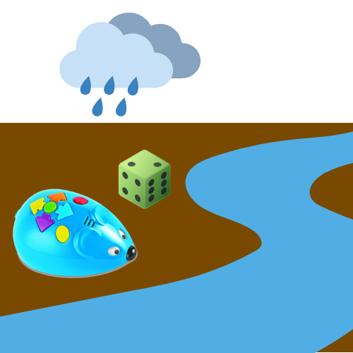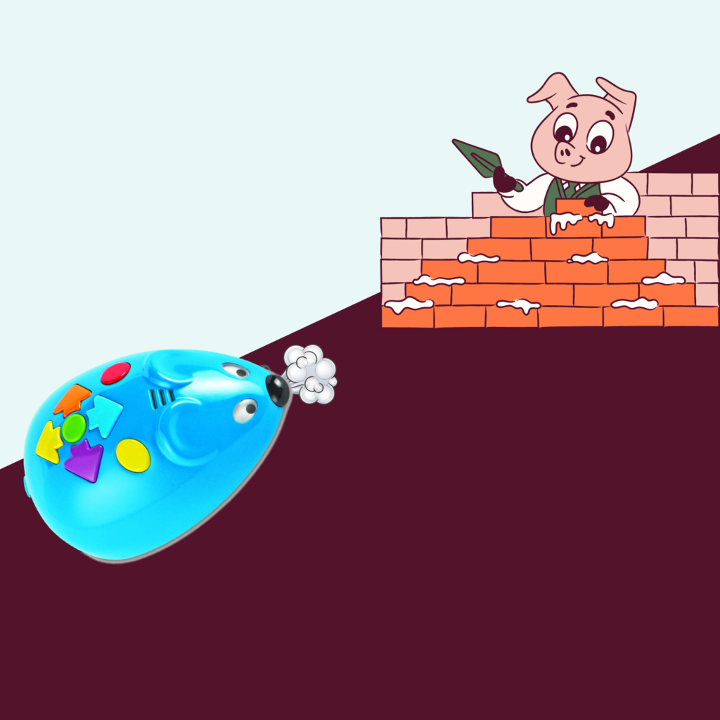 Activitat basada en el conte “El llop i els 3 porquets”. El robot fa de llop, es desplaça fins a les tres cases (palla, fusta i maons) dels porquets i intenta enderrocar-les.