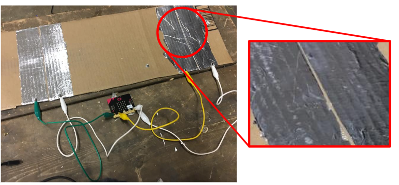 2. Amb paper d’alumini, construïu els punts d’inici i final. Per cada punt, situareu dos trossos de paper d’alumini de 4-5 cm, amb una separació d’1-2 mm. És molt important que deixeu aquesta separació i que les tires no es toquin entre elles, perquè el dispositiu no funcionaria. Cada terminal ha d’anar connectat a un cable de cocodril que connectarà amb els terminals de la placa micro:bit de la següent forma: