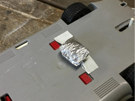 3. Per últim, caldrà enganxar un tros de paper d’alumini en la part inferior del cotxe, amb suficient gruix per què en passar per sobre dels punts inicials i final i entrar en el punt de separació d’1 mm entre les dues làmines d’alumini, produeixi el tancament del circuit, i per tant s’enviï un senyal a la placa que marcarà l’inici o el final del recorregut.