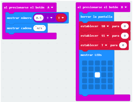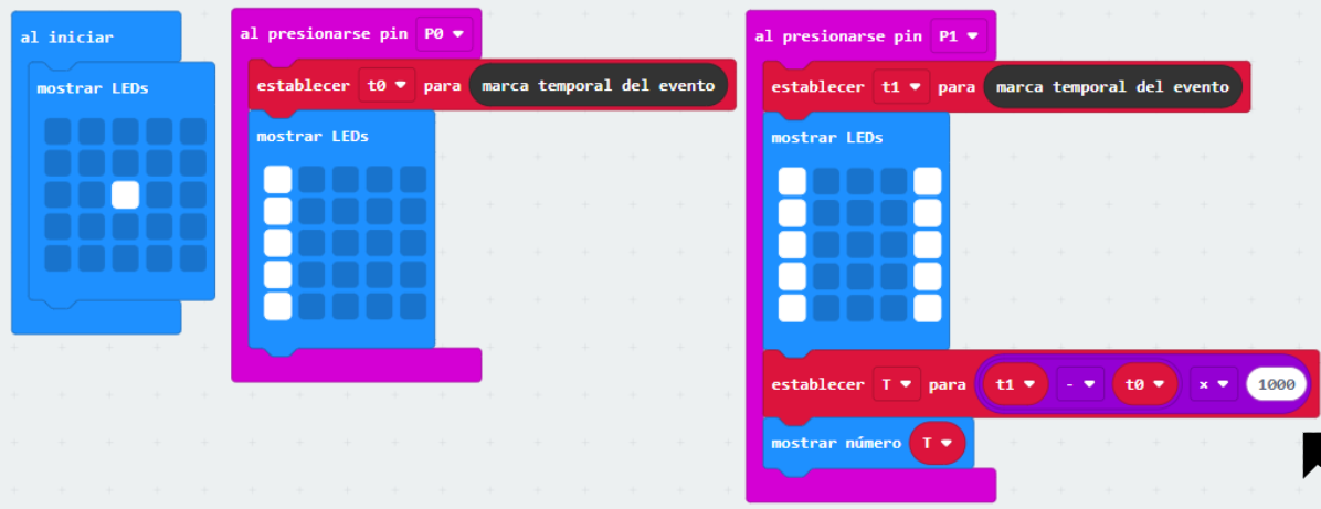 3. Com es veu a la imatge, en prémer el pin 0 començarà a comptar el temps i s’il·luminaran els LEDS de la barra esquerra. En prémer el pin 1 (FINAL) es marcarà la barra dreta, i escriureu una fórmula matemàtica, que resti el temps inicial del final i calculi l’interval de temps que ha transcorregut. Multiplicareu per 1.000, perquè la unitat de temps que detecta la micro:bit és en mil·lisegons.