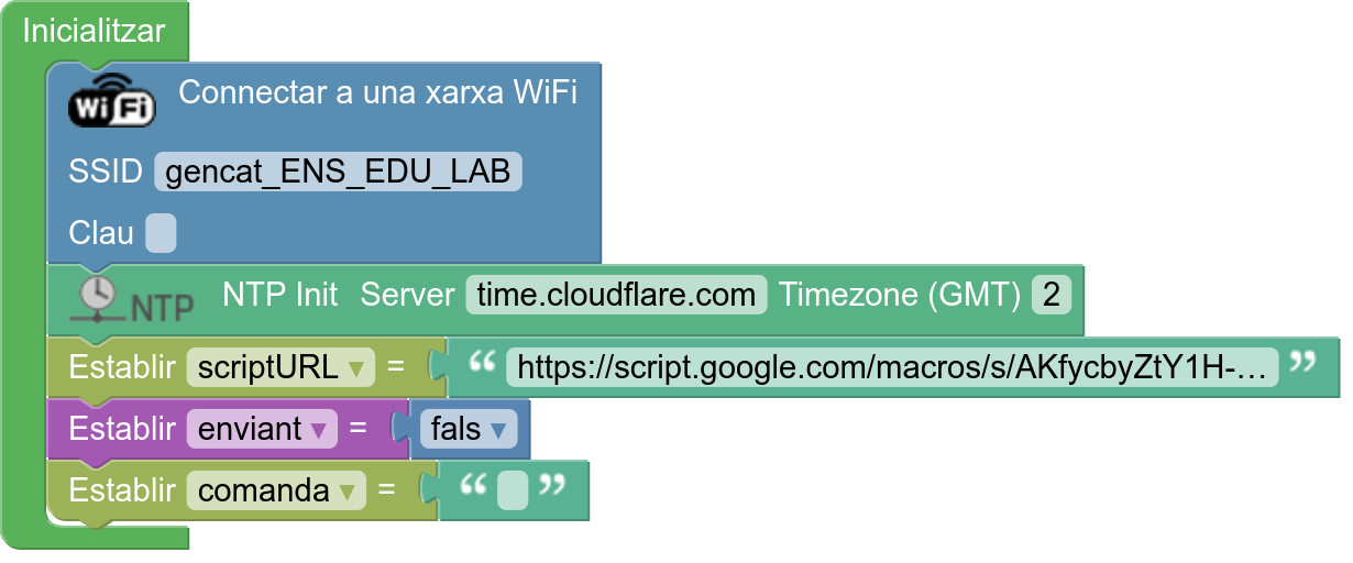5. En el bloc d’Inicialització s’ha d’establir la connexió a Internet i al servidor de temps NTP. També es defineix la variable booleana “enviant” que determina si s’han d’enviar valors o no i la variable “comanda” que conté el codi IR que emet el comandament a distància: