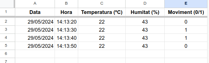 9. Transferir el programa a la placa ESP32 STEAMakers, prémer el botó de la placa d’extensió i comprovar que la informació s’envia i es registra correctament en el full de càlcul: