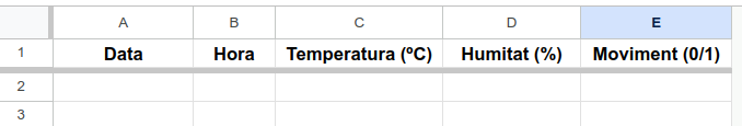 2. Escriviu en les cel·les de la primera fila “Data”, “Hora” i el nom dels valors que es vulguin registrar: