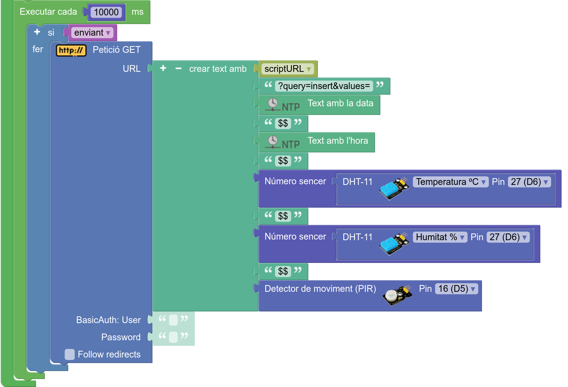8. A continuació, també en el bucle principal, s’envia a intervals la data, l’hora i els valors mesurats pels sensors externs a l’script. L’URL per afegir una fila al full de càlcul té el format (consulteu aquí): scriptURL?query=insert&values=hora$$dia$$valor1$$valor2$$valor3…